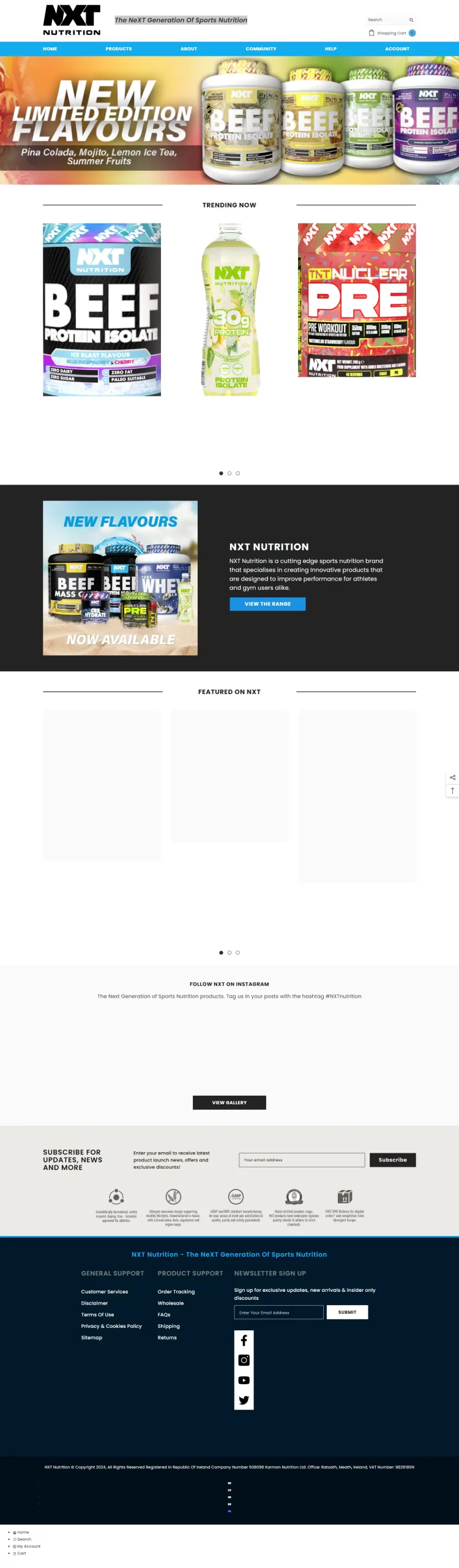 NXT Nutrition, founded in 2013 in Ireland, offers high‑quality sports nutrition products tailored for athletes and active individuals. They specialize in beef protein, whey blends, pre-workout formulas, creatine hydration mixes, and innovative ready-to-drink options—all made with premium ingredients, laboratory-tested for quality, and delivered with strong customer service support.