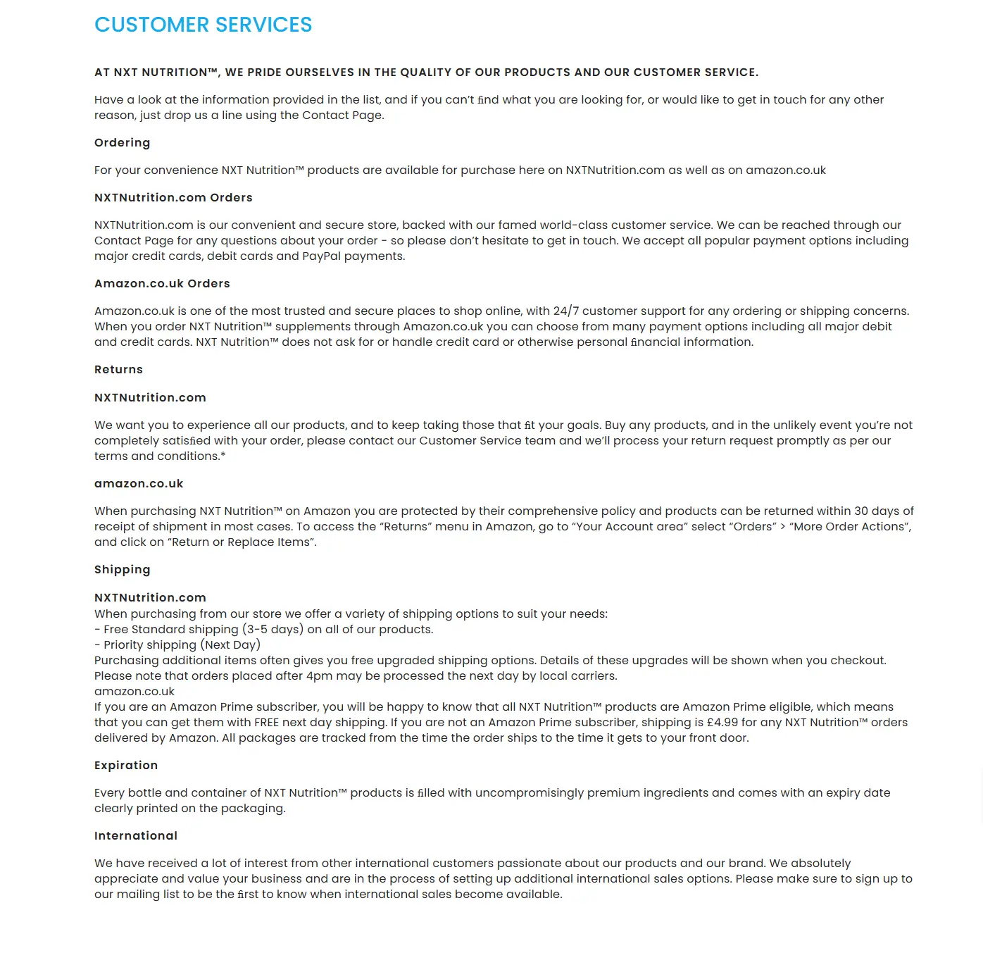 Order fulfillment is seamless via nxtnutrition.com and Amazon UK. Customers can pay using credit cards, debit cards, or PayPal, and receive support for order queries via the Contact Us page. International shipping is being developed, with alerts for upcoming availability.